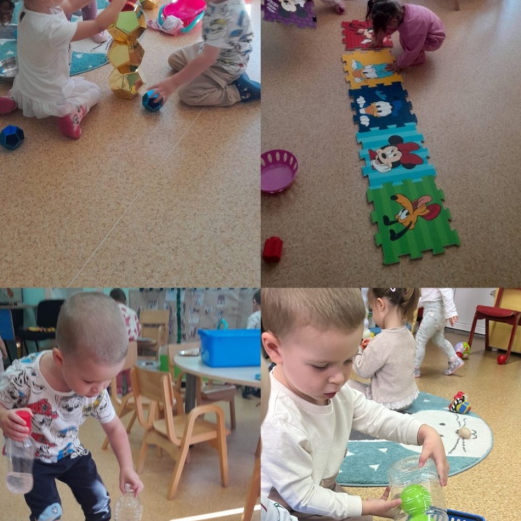 Деца јаслене групе су кроз пројекат “Слагањем до игре” истраживала како се слажу пузле, флаше и светлуцаве лоптице