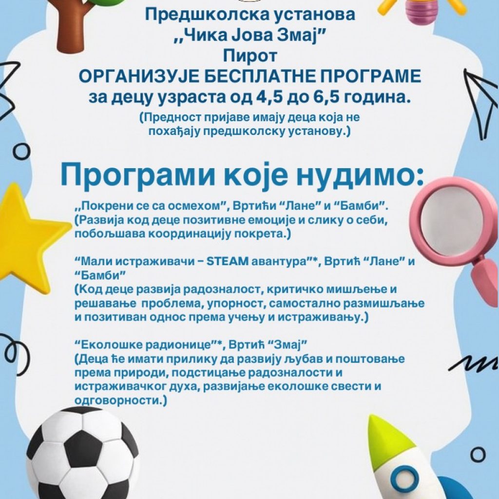 Програме ће водити васпитачи Предшколске установе.